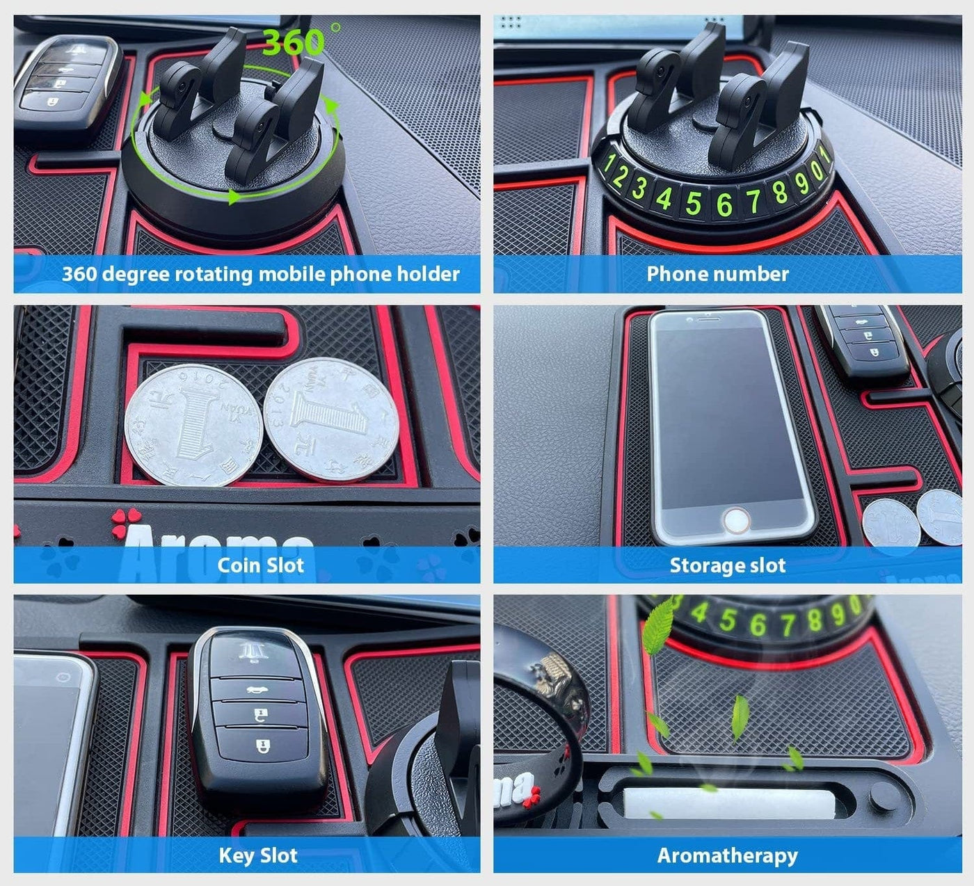 360º Movable Phone Stand: Not just a holder, but a 360° spinning companion for your phone, allowing adjustments for perfect visibility, coupled with a unique feature to display or hide phone numbers while parking.